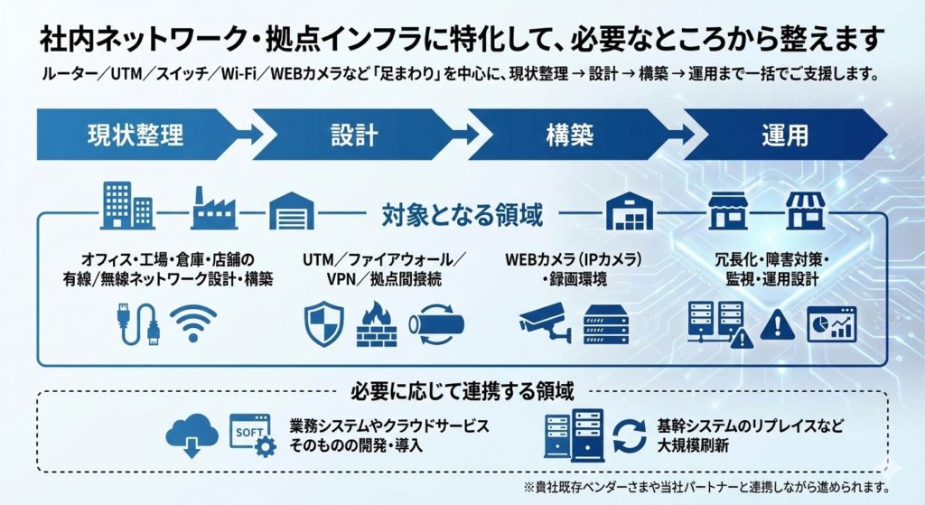 「配線やスイッチ構成の見直しだけ」「UTM 周りだけ」「Wi‑Fi だけ」といった部分的なご依頼もよくあります。